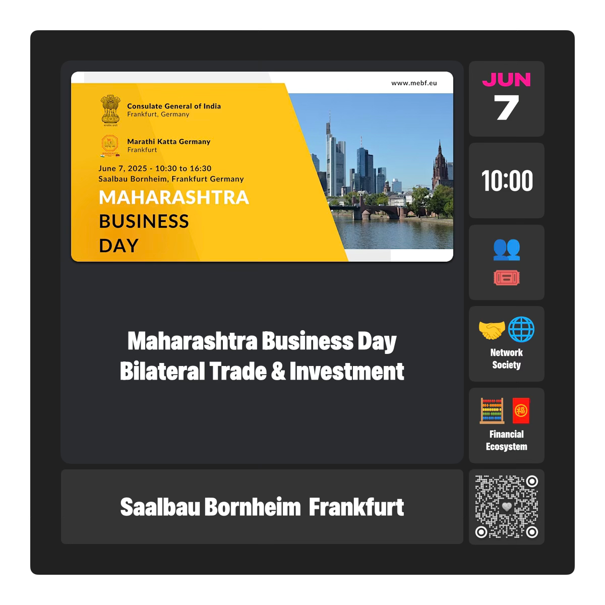 The Consulate General of India, Frankfurt, in partnership with Marathi Katta Germany, is organizing Maharashtra Business Day on 7 June 2025 at Saalbau Bornheim, Arnsburger Str. 24, 60385 Frankfurt.