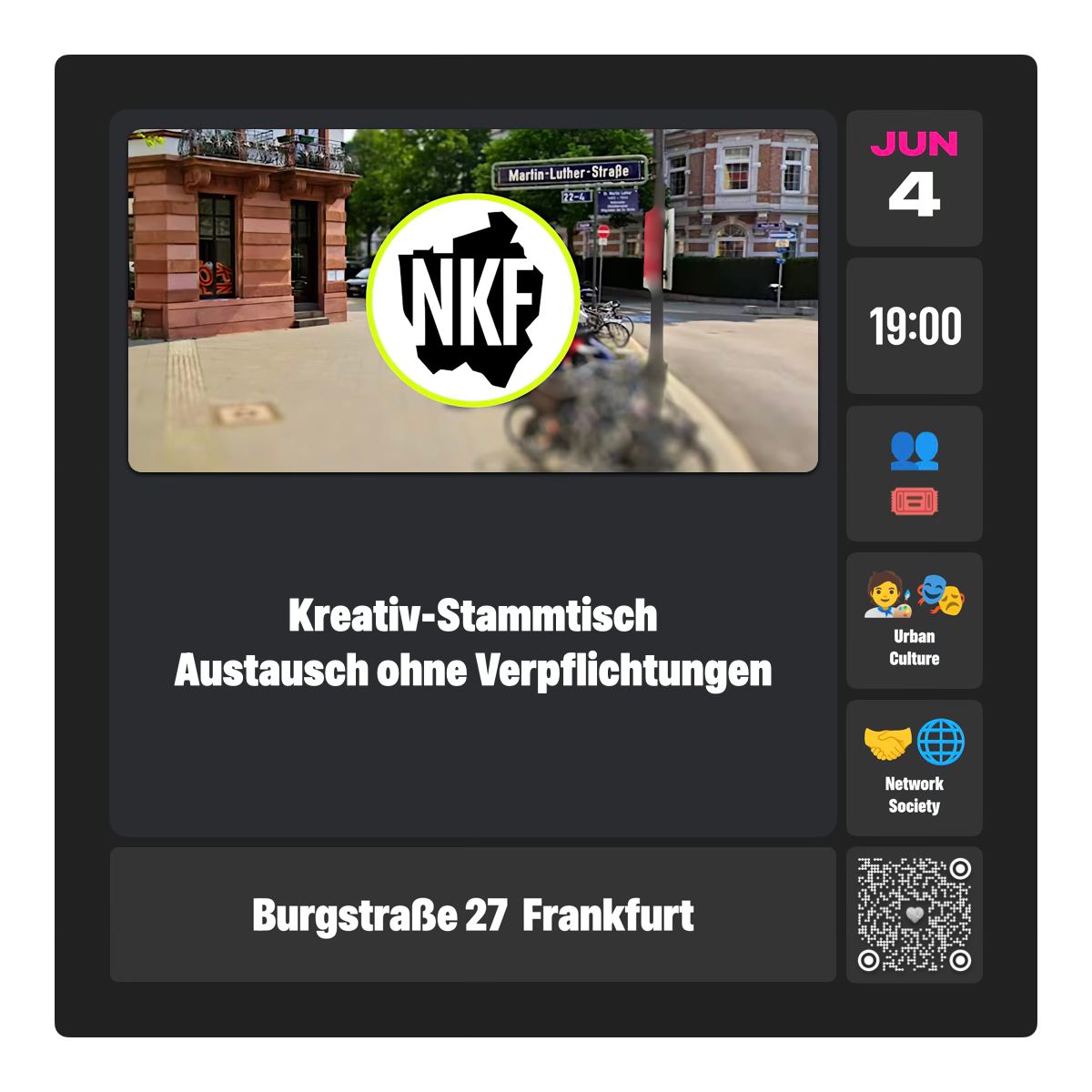 Interesse an Kreativität und Austausch? Der NKF Stammtisch ist der monatliches Treffen für Kreative im Frankfurter Nordend. In entspannter Atmosphäre kannst du dich mit anderen Kunst- und Designinteressierten austauschen, neue Kontakte knüpfen und Ideen teilen. Es gibt keine Verpflichtungen oder Mitgliedschaften – einfach vorbeikommen, Gespräche führen und die lokale kreative Szene kennenlernen.