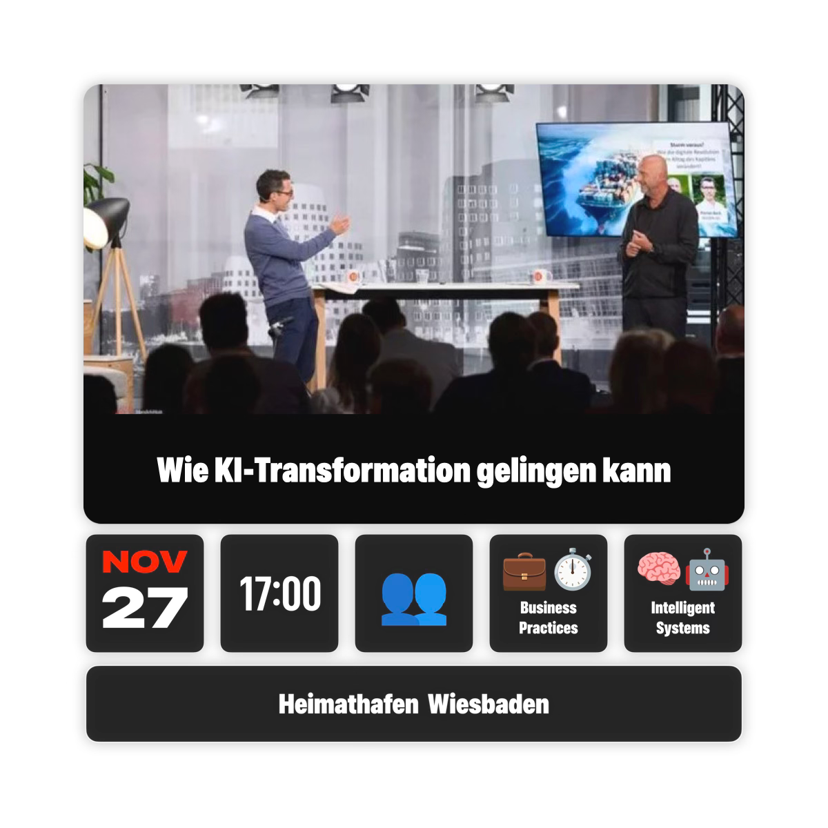 Kein “Death by PowerPoint”. Kein Sales-Pitch. Aber praxisnaher Input von echten Experten und viel Raum für den Austausch untereinander. Also: Bring’ deine eigenen Erfahrungen mit KI im Unternehmen mit!