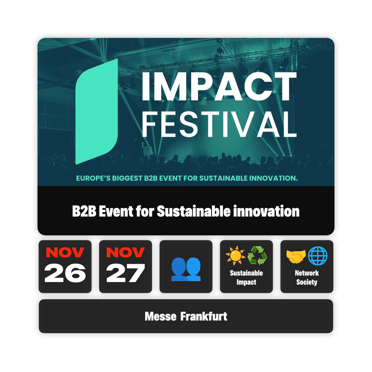 The IMPACT FESTIVAL is Europe’s largest B2B event for sustainable innovation and connects sustainability solutions with companies and investors to accelerate economic transformation.
