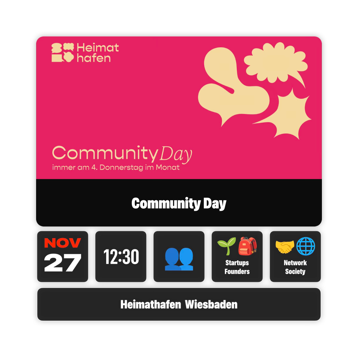 Beim Community Day öffnen wir den Heimathafen für alle, die Lust auf Austausch, neue Impulse und gemeinsames Weiterkommen haben. Ganz egal, ob du Freelancer:in, Gründer:in, Angestellte:r oder einfach neugierig bist – hier triffst du auf Menschen, die etwas bewegen wollen und sich gegenseitig unterstützen.