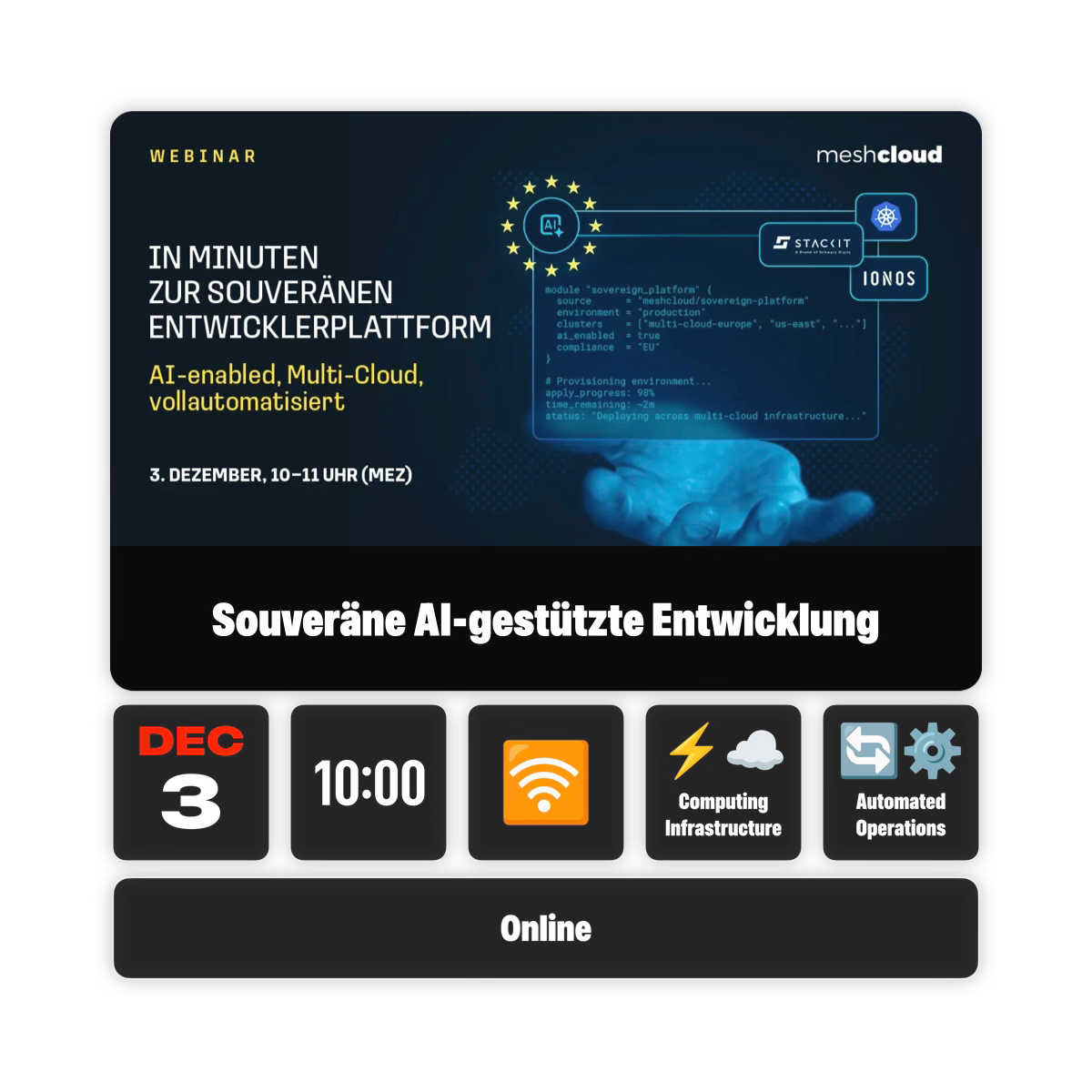 Was wäre, wenn sich Entwickler in wenigen Minuten eine komplette, souveräne Cloud-Umgebung bereitstellen könnten – automatisch, sicher und bereit für AI-gestützte Entwicklung? In diesem Webinar zeigen wir live, wie Organisationen mit einer souveränen Multi-Cloud-Plattform ihre Entwickler befähigen, Innovation zu beschleunigen, ohne Kontrolle zu verlieren. Erleben Sie, wie sich Governance und Geschwindigkeit vereinen – von null zur produktiven Umgebung in Minuten.