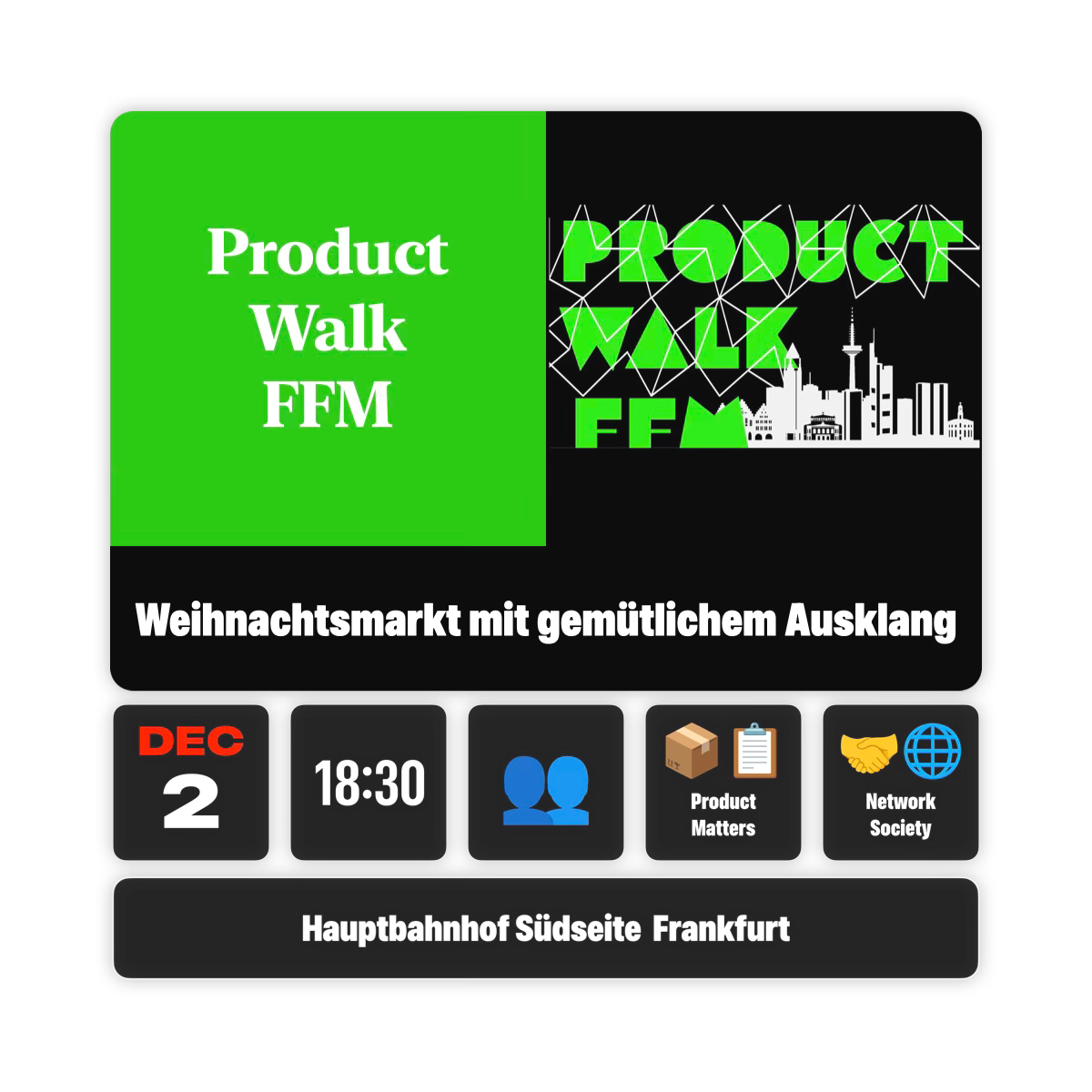 Lasst uns das vor-weihnachtliche Frankfurt mit einer Runde um den Main genießen. Mit dabei sind all die Themen rund um Produktmanagement und Produktgestaltung. Und vor allem eure Peers und Produktschaffende aus der Community. Ein Produkt Walk classic!