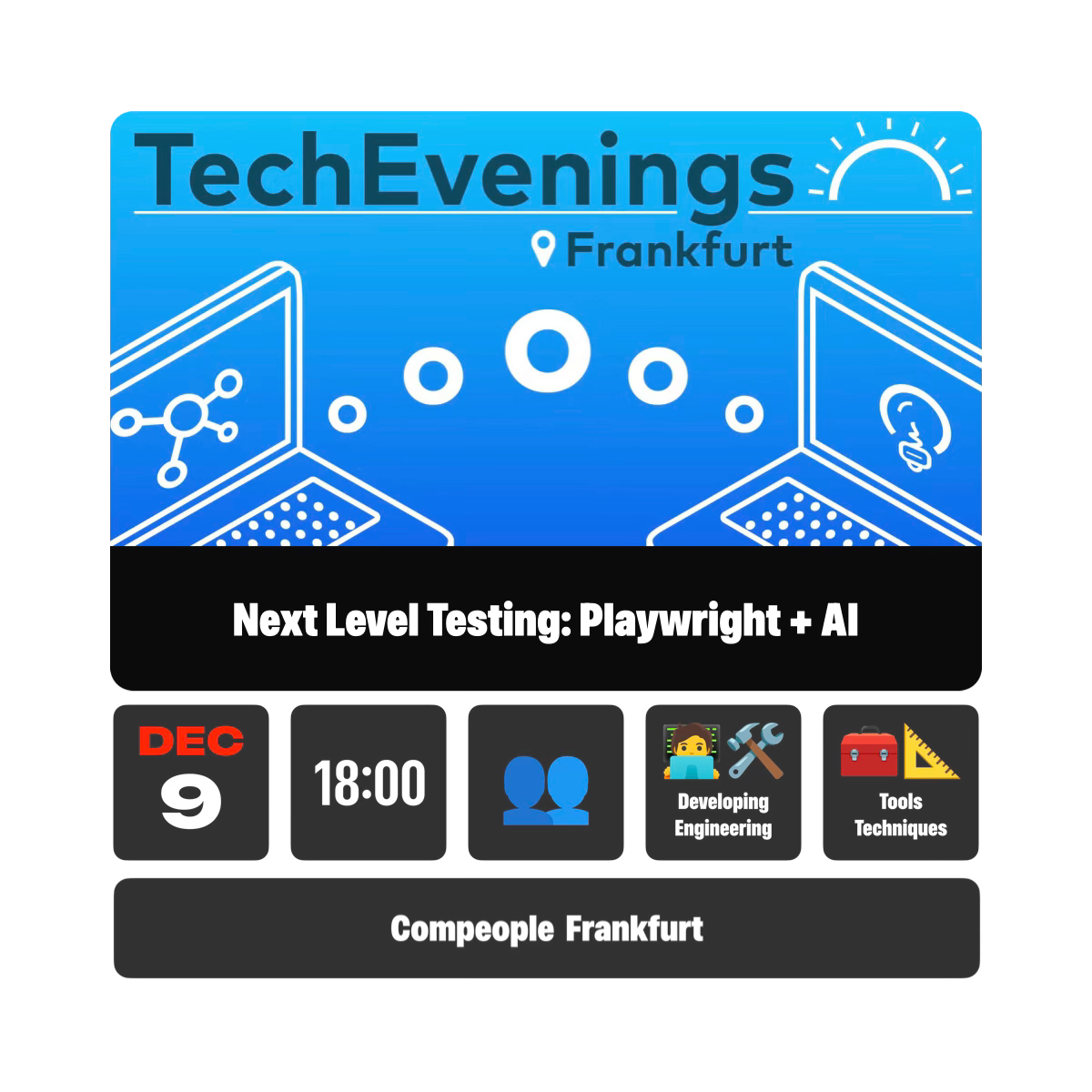 Wir laden euch zu unserem nächsten TechEvenings-Event ein! Diesmal dreht sich alles um End-to-End Testing (E2E), den Einsatz von Playwright und wie uns KI-Assistenz dabei das Leben leichter macht.