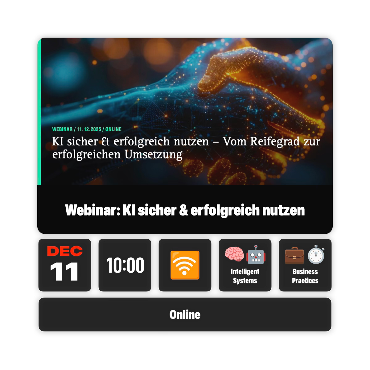 Viele Unternehmen fragen sich: Wo stehen wir bei KI – und wie geht’s weiter? In diesem Webinar erfahren Sie, wie Sie den KI-Reifegrad Ihres Unternehmens einschätzen, klare Prioritäten setzen und rechtliche Anforderungen wie den EU AI Act sicher berücksichtigen. Erhalten Sie praxisnahe Orientierung, um KI strategisch, wirtschaftlich und compliant einzuführen.