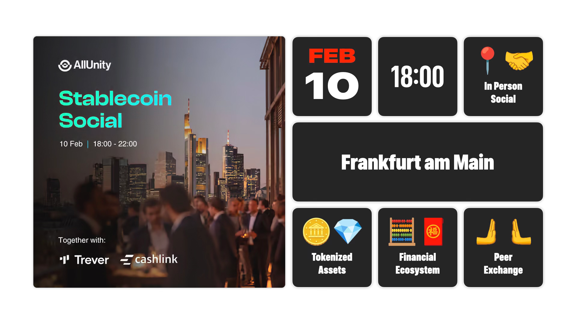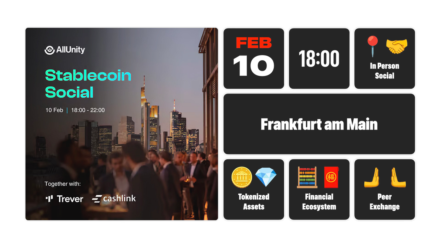 Join us for the first edition of Stablecoin Social 2026, a premier side event to the Frankfurt Digital Finance conference hosted by AllUnity, Trever and Cashlink.