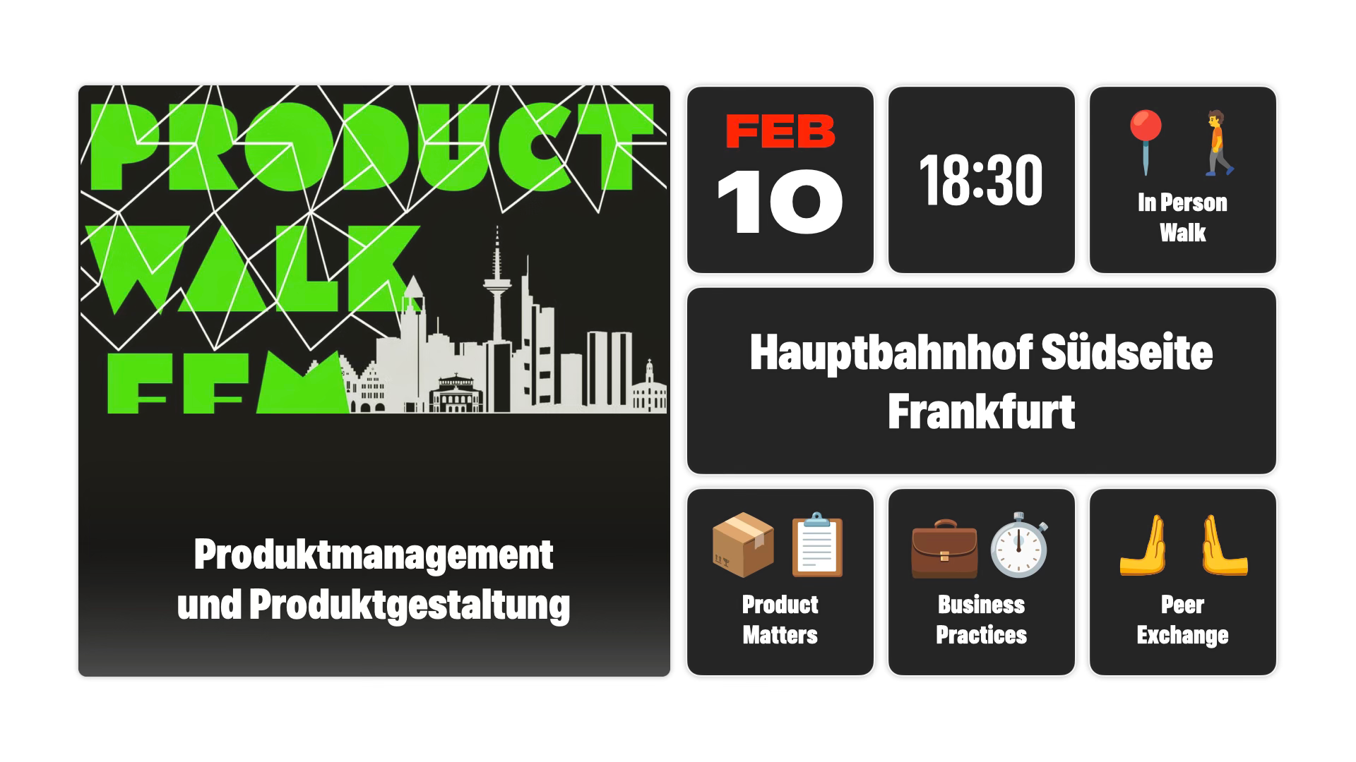Lasst uns das vor-närrische Frankfurt mit einer Runde um den Main genießen. Mit dabei sind all die Themen rund um Produktmanagement und Produktgestaltung. Und vor allem eure Peers und Produktschaffende aus der Community.