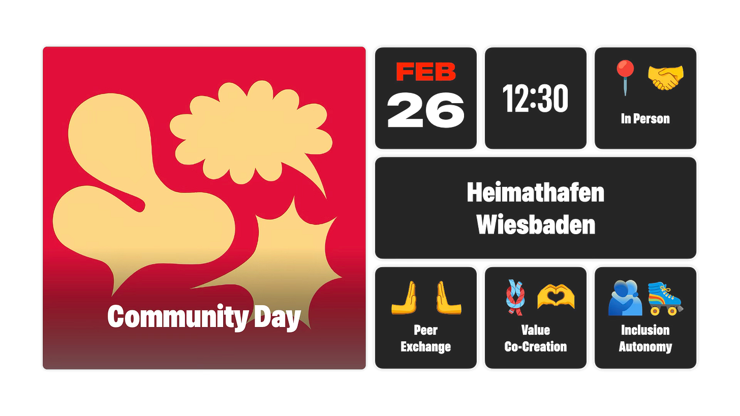 Beim Community Day öffnen wir den Heimathafen für alle, die Lust auf Austausch, neue Impulse und gemeinsames Weiterkommen haben. Ganz egal, ob du Freelancer:in, Gründer:in, Angestellte:r oder einfach neugierig bist – hier triffst du auf Menschen, die etwas bewegen wollen und sich gegenseitig unterstützen.Seit über zehn Jahren ist der Heimathafen ein Ort, an dem Netzwerke entstehen, Ideen wachsen und Freundschaften beginnen. Mit dem Community Day möchten wir genau das weiterführen – in entspannter Atmosphäre, mit offenen Gesprächen und Raum für Neues.