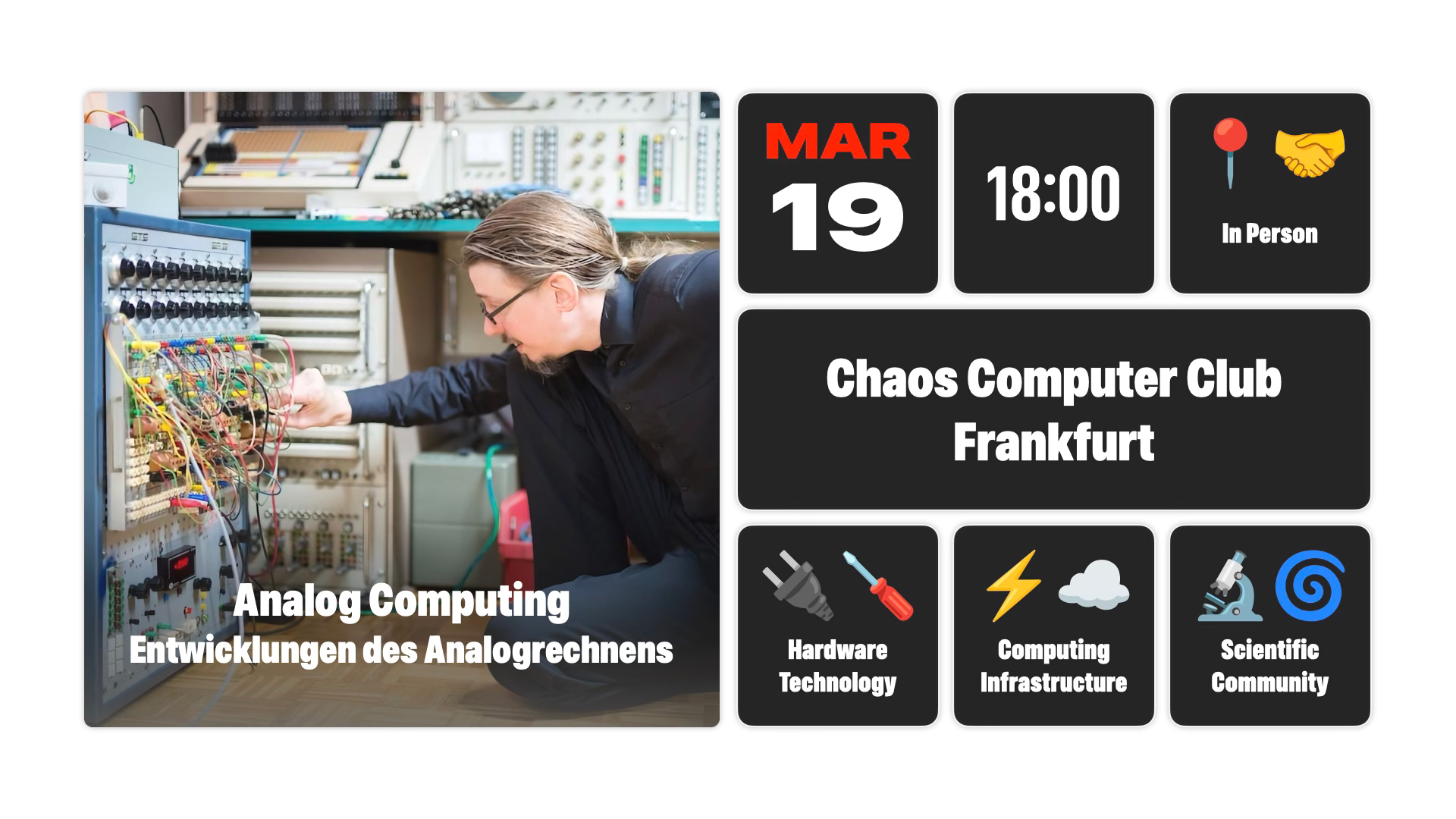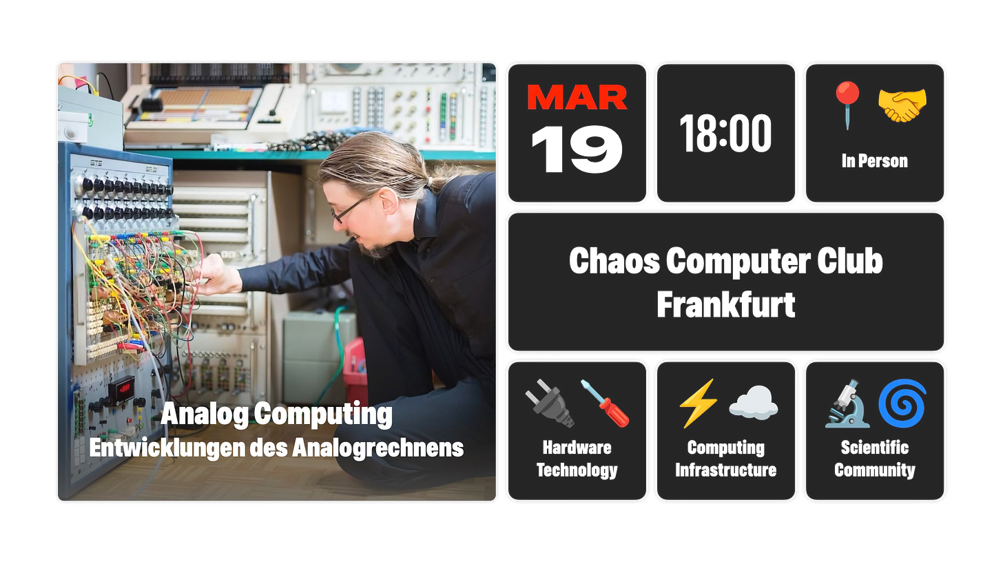 Wir freuen uns am Donnerstag, den 19.03. ab 18 Uhr Prof. Dr. Bernd Ulmann erneut für einen Vortrag über Analog Computing bei uns begrüßen zu dürfen.