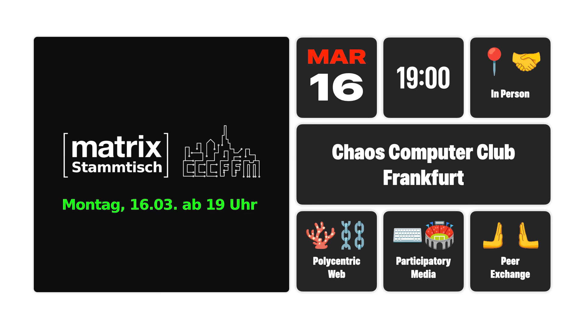 Am Montag, den 16.03. findet zum ersten Mal der Matrix Stammtisch beim CCC-FFM statt.