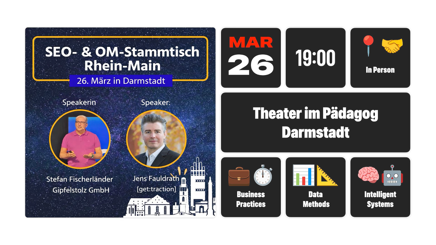 Die Rahmenbedingungen für Suchmaschinenoptimierung verändern sich rasant. Beim SEO- & OM-Stammtisch am 26. März werfen wir einen genauen Blick darauf, wie sich traditionelles SEO und neue KI-Technologien miteinander vereinen lassen. Dich erwarten zwei tiefgehende und praxisnahe Vorträge: